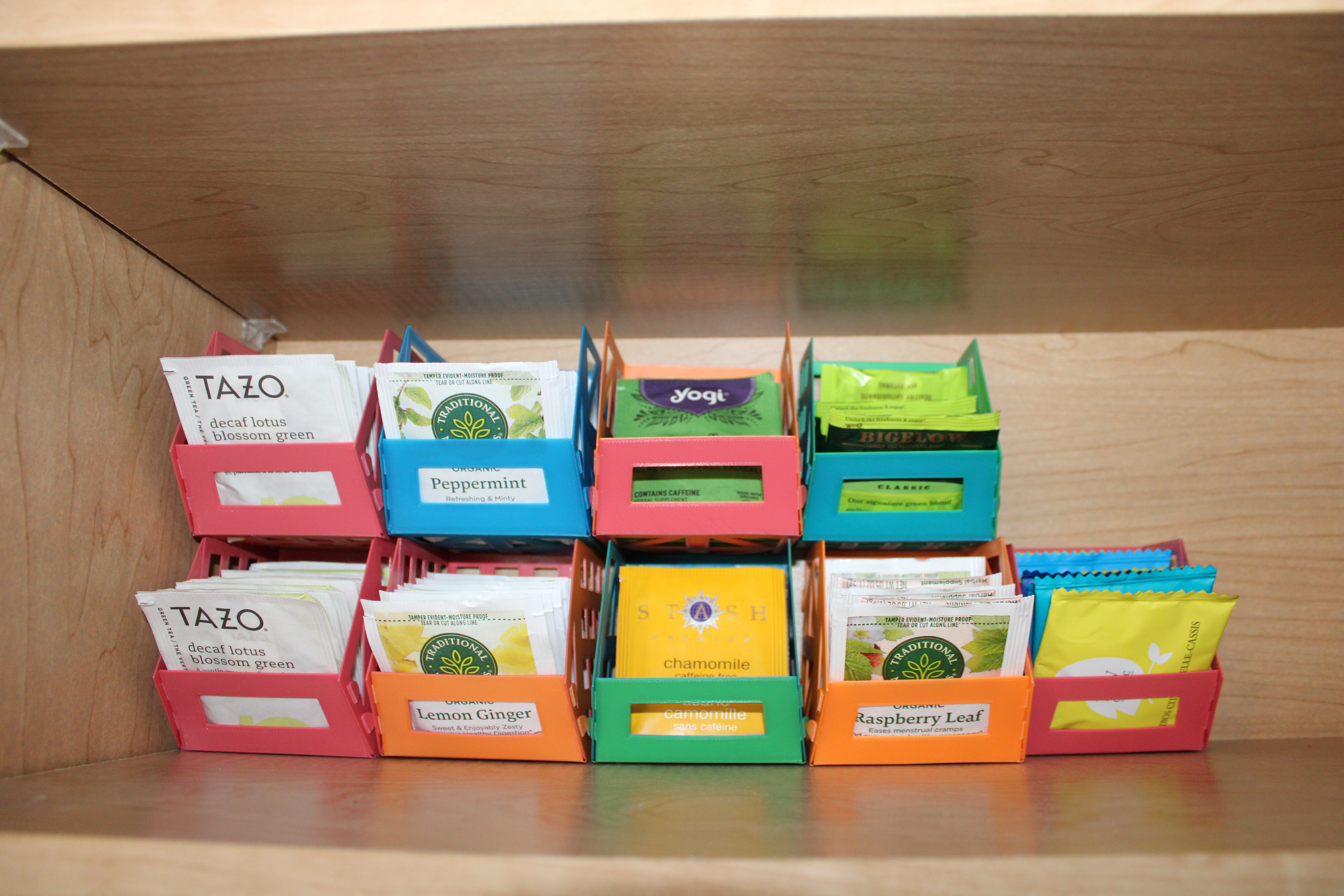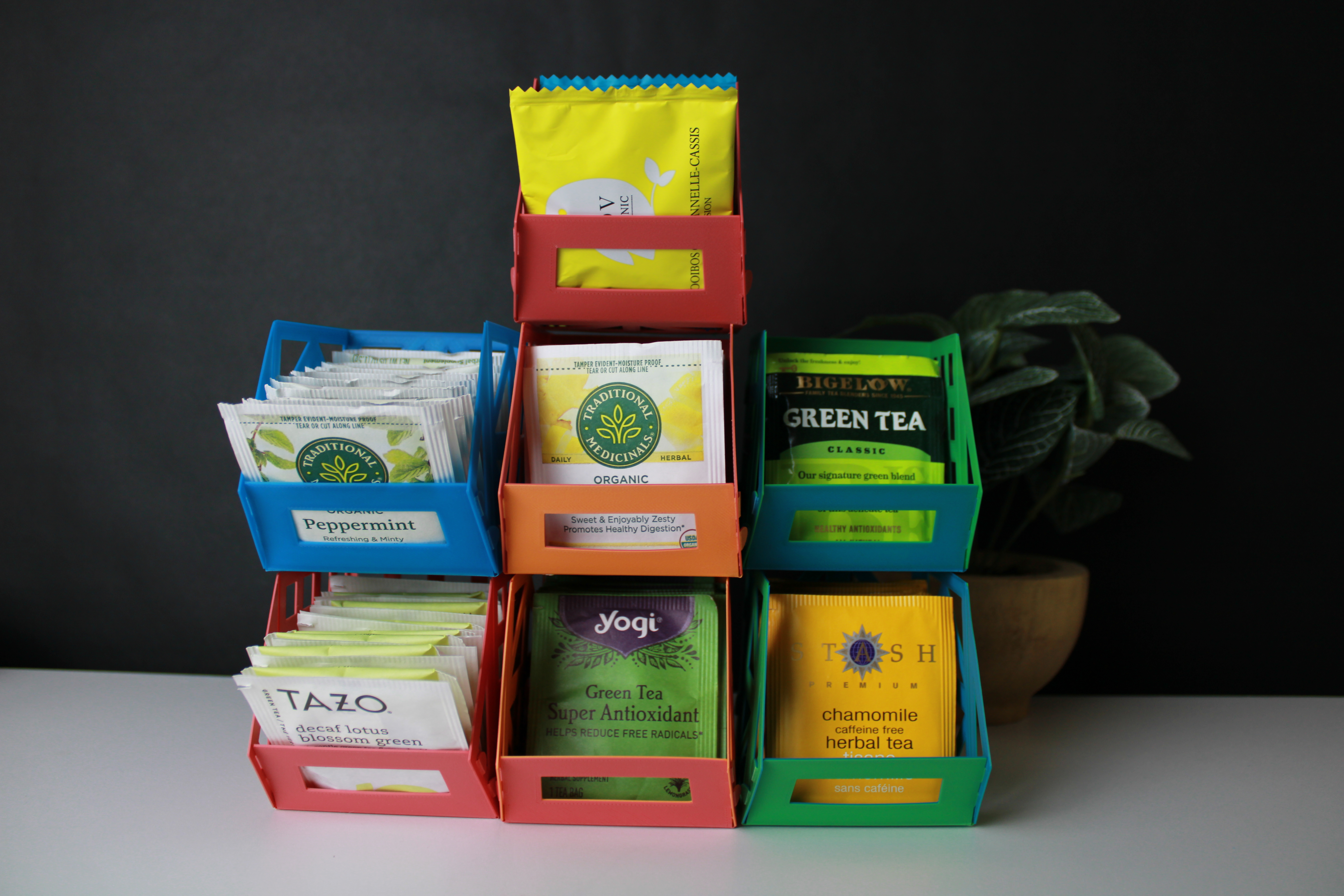 These foldable tea bag baskets are perfect for the filament-conscious tea-lover! They print in under two hours, fold really simply, and are designed to be stackable. My family tends to collect dozens of tea bags from a variety of brands, so when I went about designing these tea baskets my goal was to have a modular, sustainable, fast to produce solution. I could have made the design for printing in vase-mode, which would have still required very little filament, but it would have had a longer print time and wouldn’t have allowed for the patterned “basket appearance”. As an alternative solution, I made the print foldable with tabs that get inserted into slots and are folded over to lock in place.