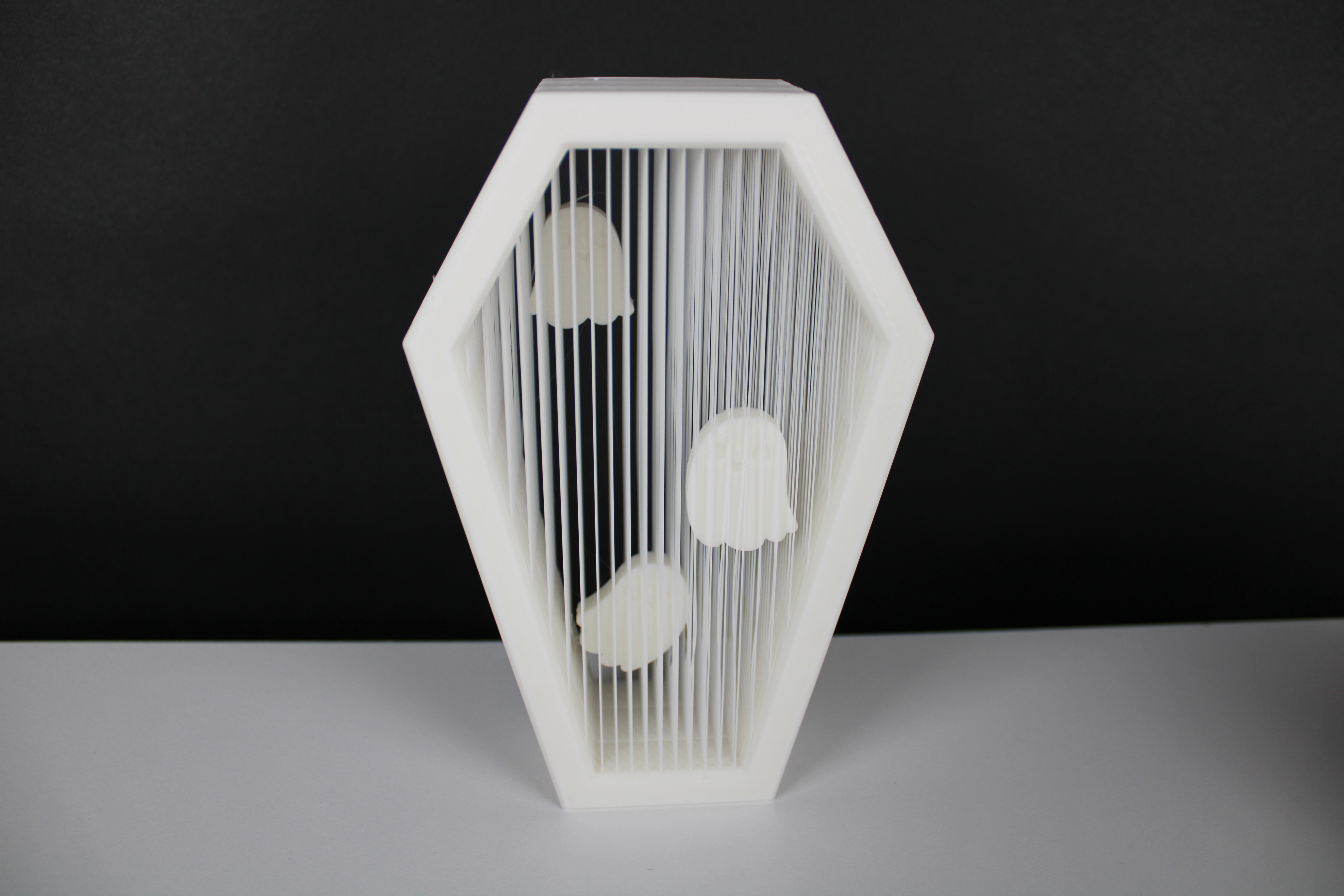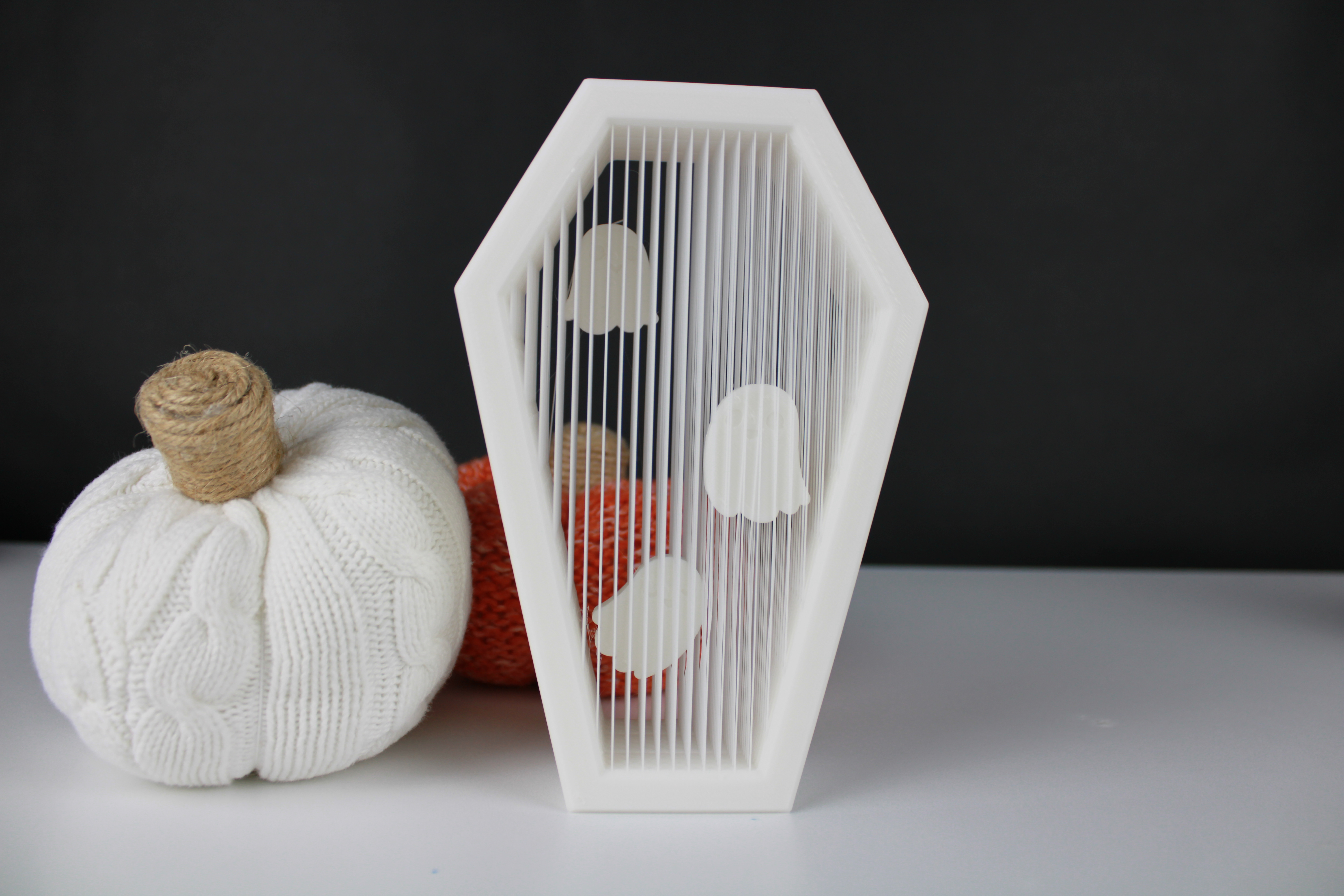 A trio of cute floating “ghosties” return from beyond the grave to add some playful spookiness to your Halloween decorations. My favorite element in this design is the staggered depths of the ghost figures. To achieve this, I designed the model to print in three parts that are then stacked. This also allowed the solid ghosts to be printed without supports, which would have otherwise interfered with the bridging strings.
