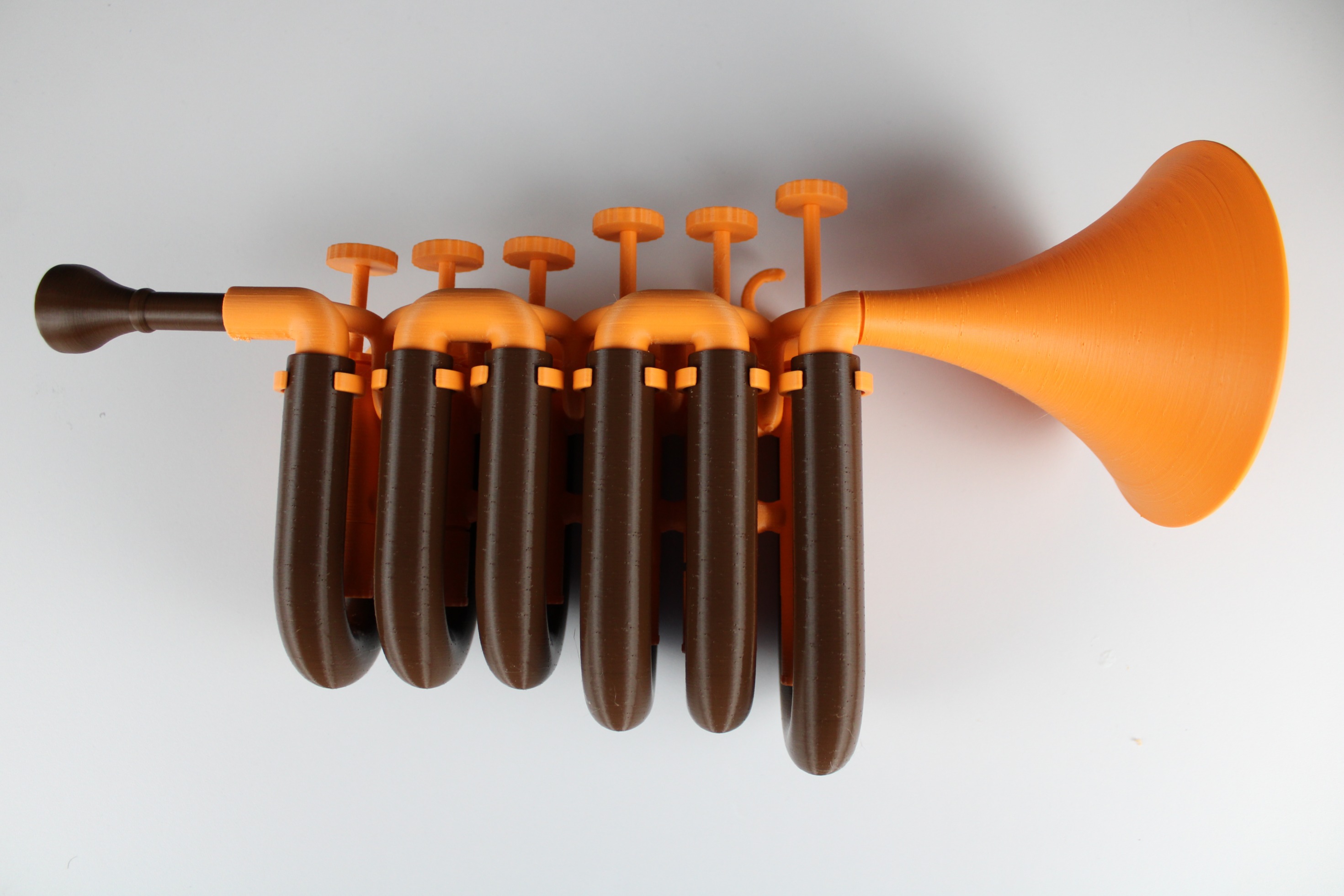 Reminiscent of brass instruments from a bygone time that were so intricate they verged on being purely experimental, this overly-complicated trumpet involves a seemingly needless twist on typical brass instruments. Usually, brass instrument valves function by redirecting flow of air to different lengths of tubing to change the pitch of the instrument, and thereby play different notes. Instead of doing that, I decided to just have several valves that move slides (similar to a trombone) to extend the tubing length.