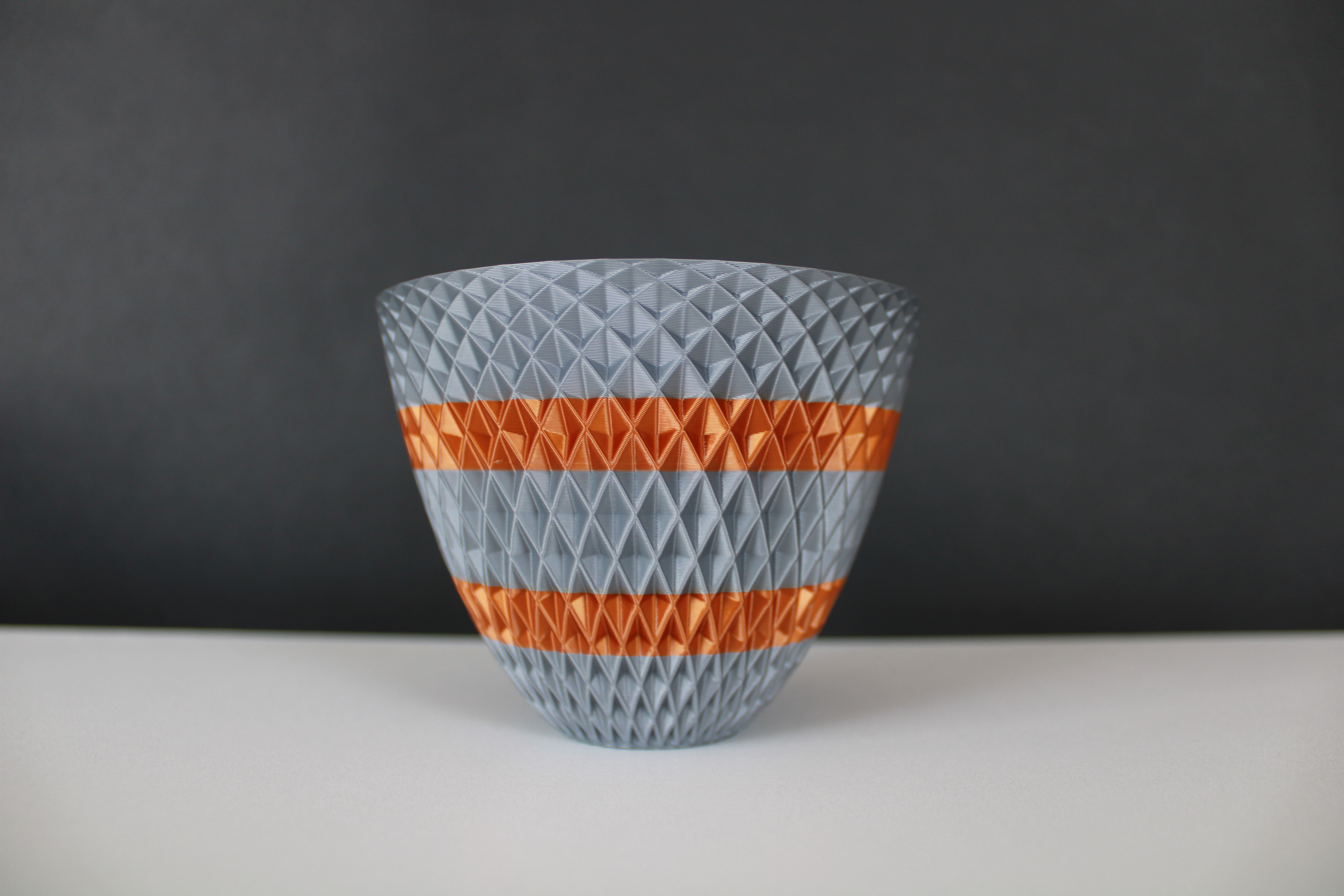 Patterned vase-mode print with a contrasting sleek exterior and jagged interior. This is the first variation of this model, which is shorter and wider. The tetrahedron vases are both remixes of my Tetrahedrinsanity Bowl, utilizing the same fascinating pattern but with less filament consumption.