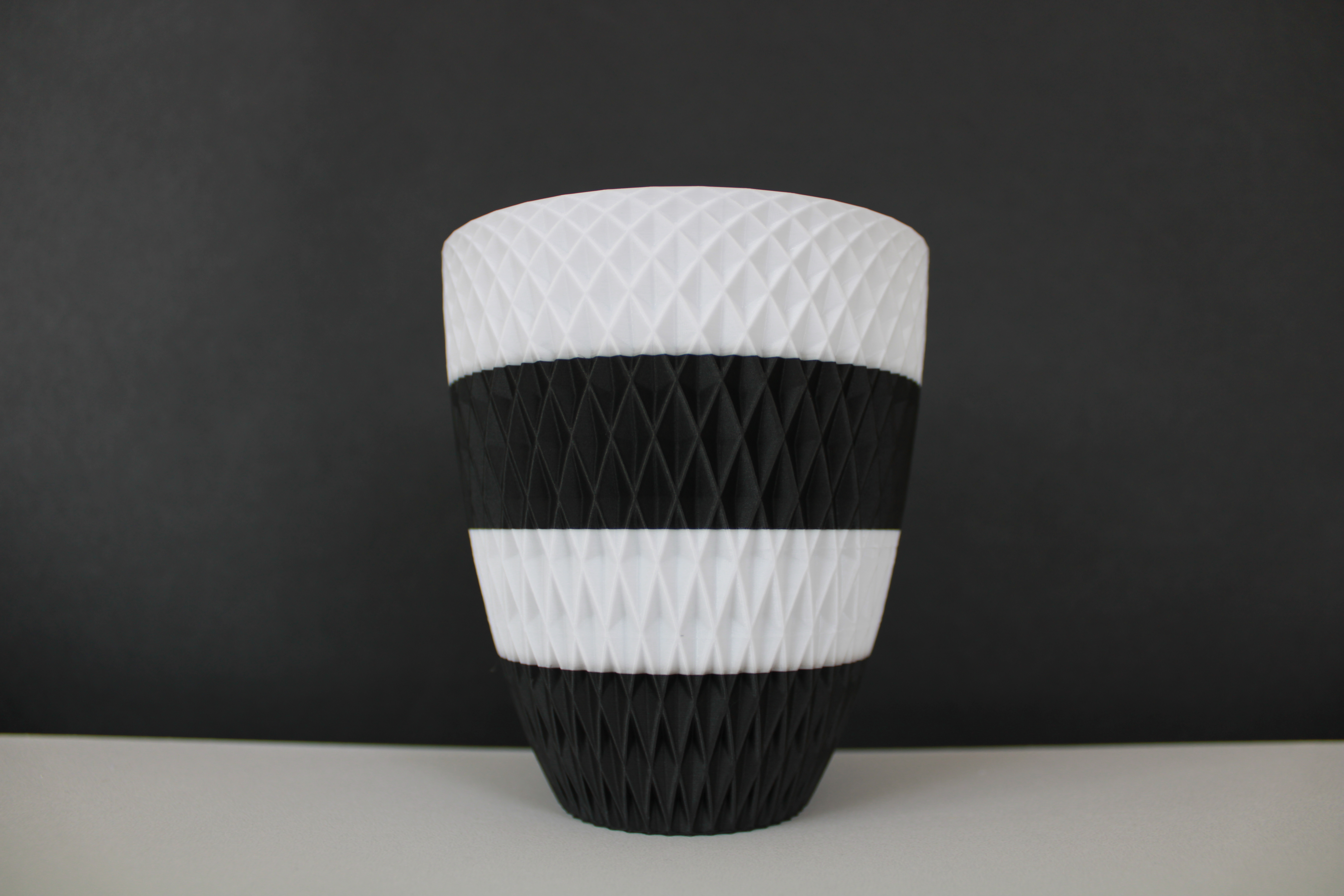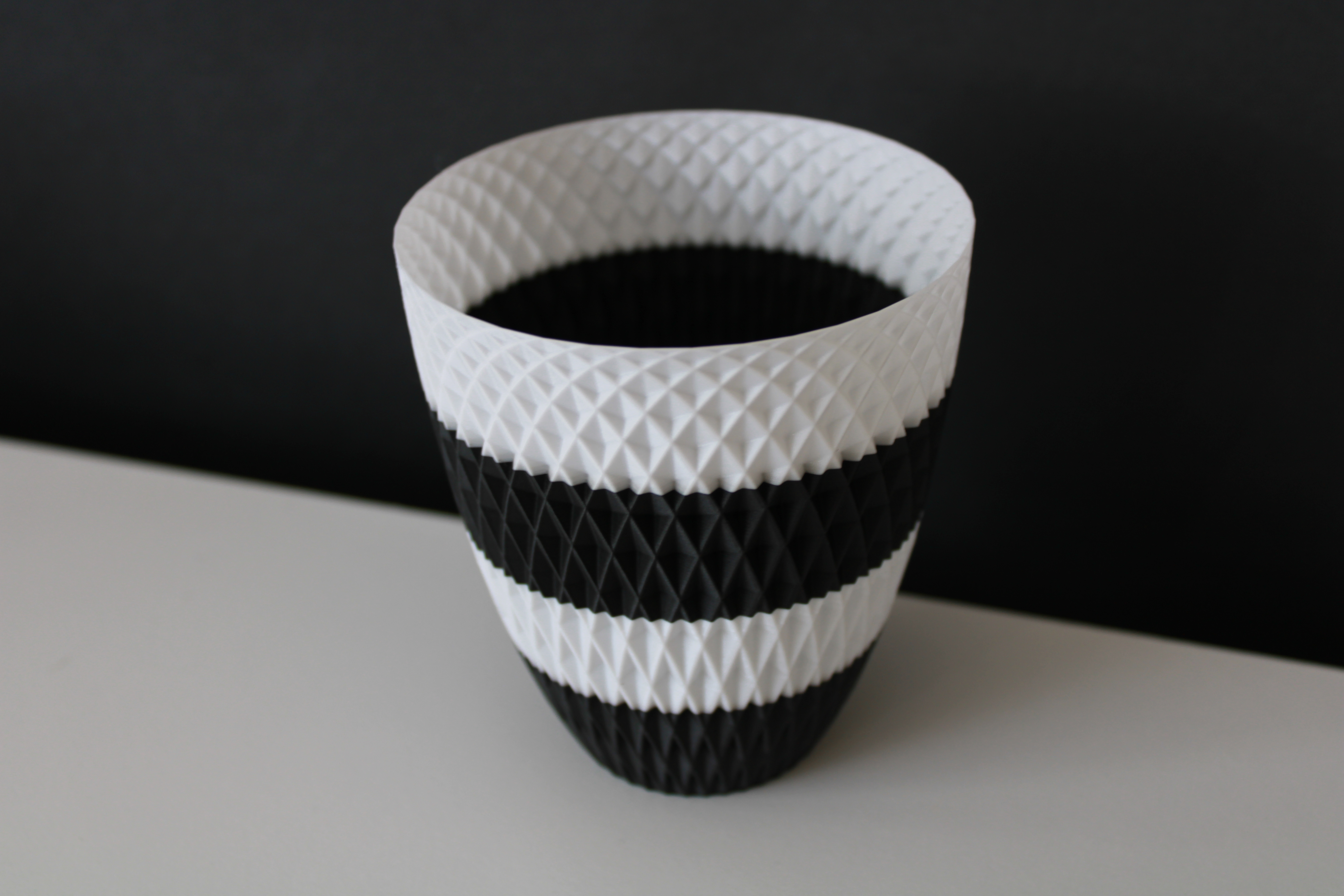 Patterned vase-mode print with a contrasting sleek exterior and jagged interior. This is the second variation of this model, which is taller and slimmer. The tetrahedron vases are both remixes of my Tetrahedrinsanity Bowl, utilizing the same fascinating pattern but with less filament consumption.