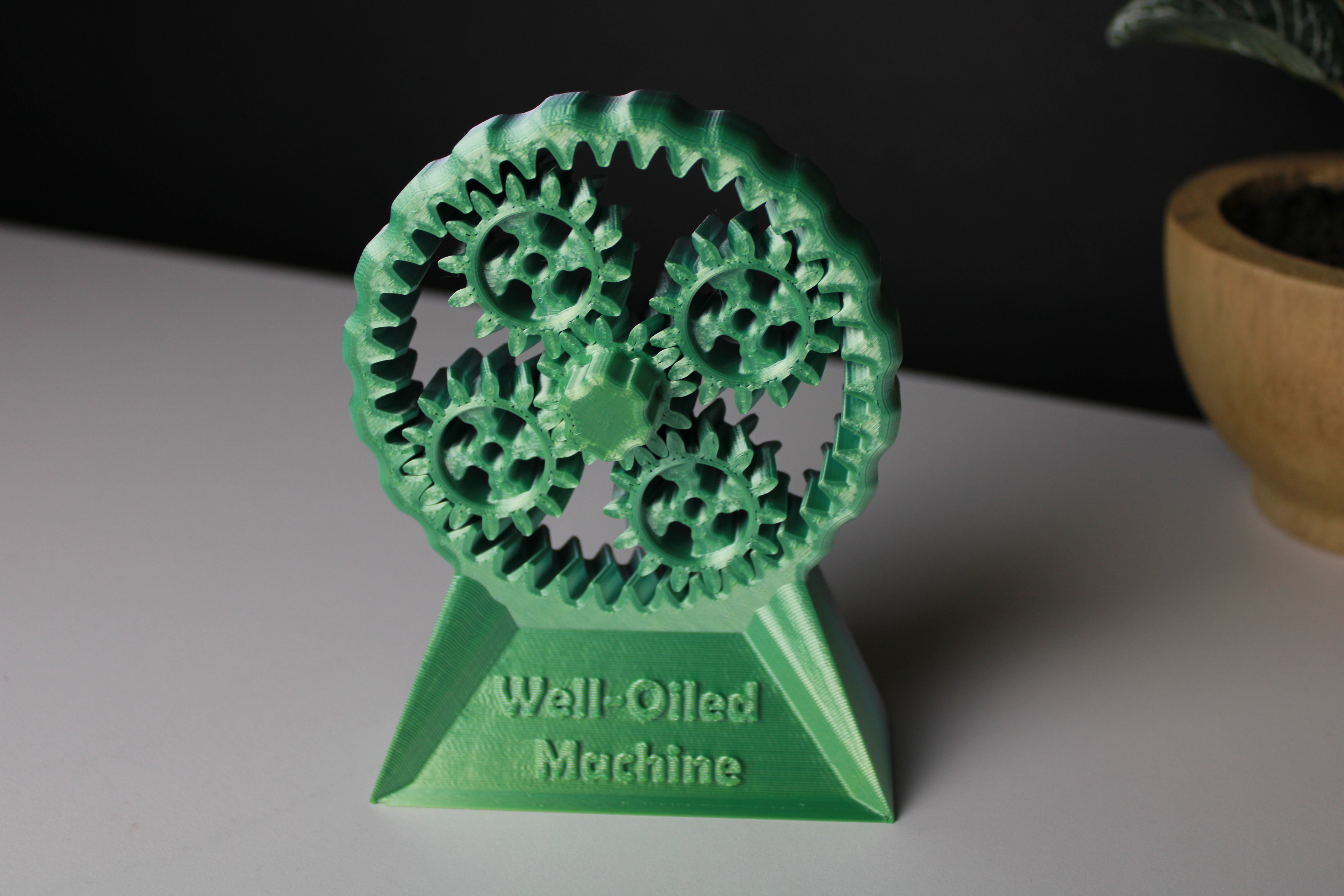 A fully print-in-place, mechanical, interactive trophy, perfect to congratulate the team that works like a “well-oiled machine”, or yourself! When tasked to create an entirely unique trophy model, my first thought was how static trophies usually are. They just sit on a shelf and collect dust. So, I decided to go in the opposite direction with this design, adding an entertaining interactive element with a small set of herringbone planetary gears that are driven by the centered knob. Another interesting challenge to this design was making the gears print-in-place, which involved a lot of careful aligning and tolerancing.