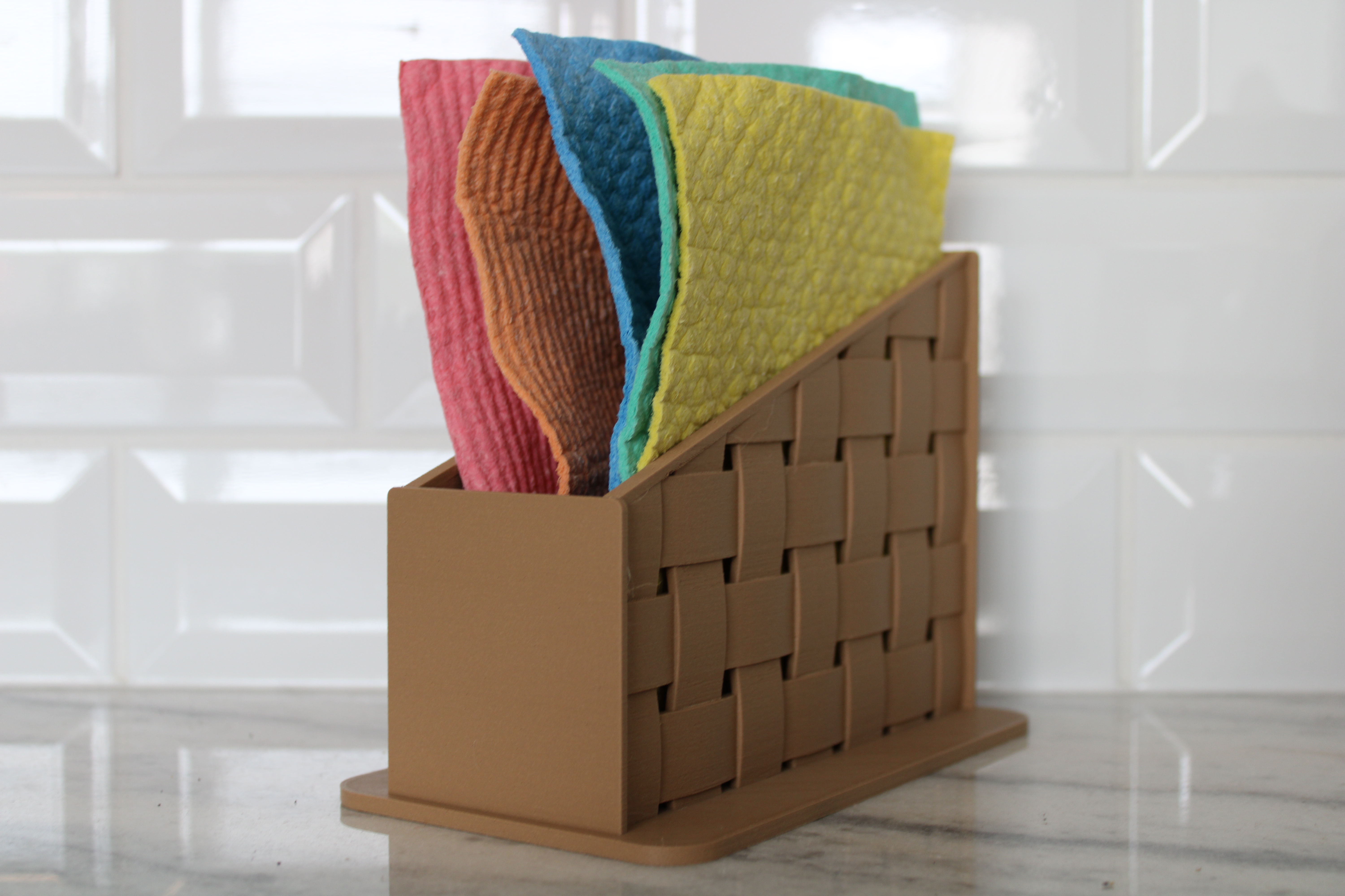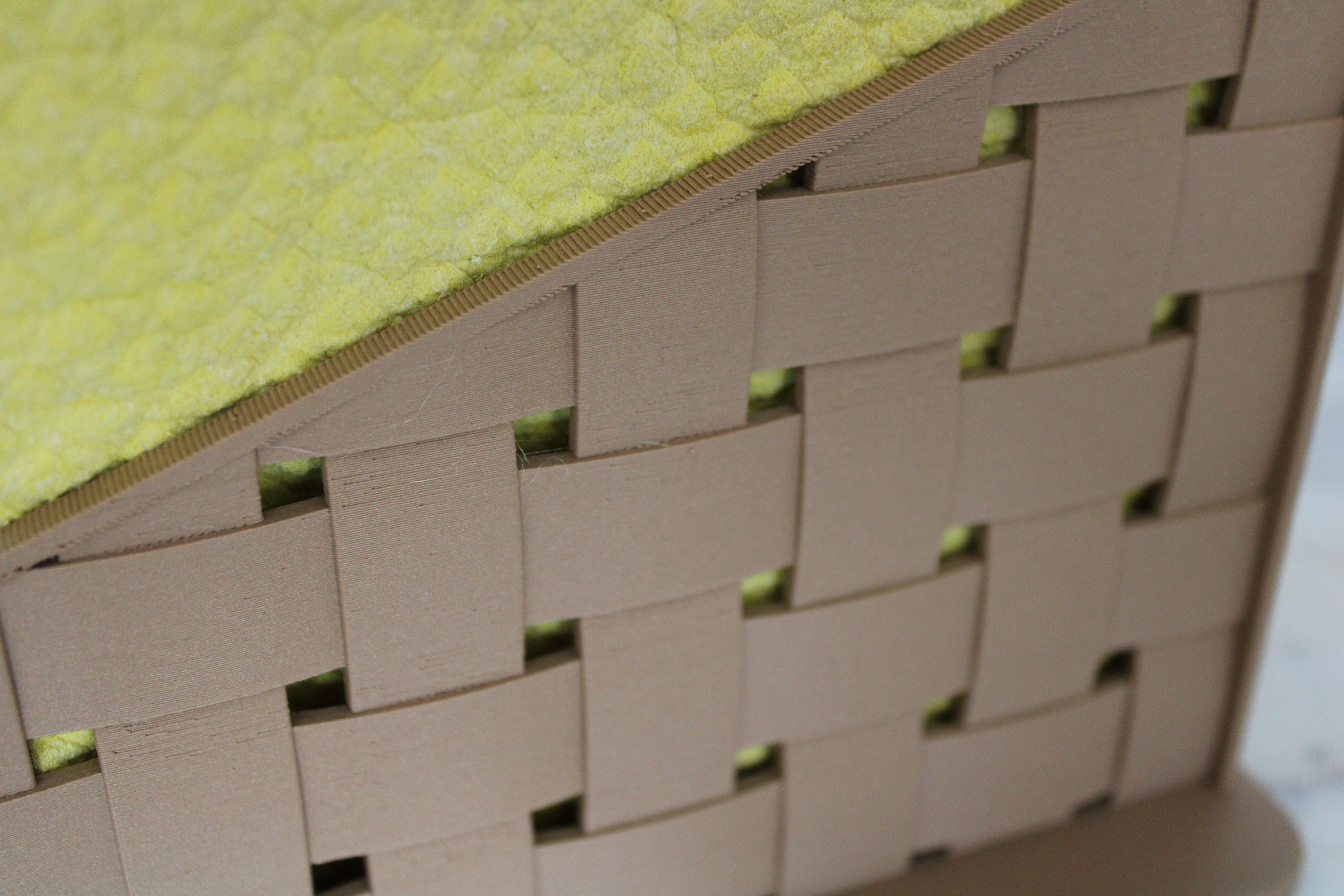 This was my first attempt at designing and printing the illusion of a woven basket by using alternating and overlapping patterned sweeps in two directions. I was pretty conservative with this design, as can be seen from the solid endplates and relatively thick weave strips. It was a good starting point to test the limits of my printer, especially with the amount of overhangs and bridging involved. In the future, I’ll try more complex designs that push the limits of my printer, while hopefully still avoiding supports.